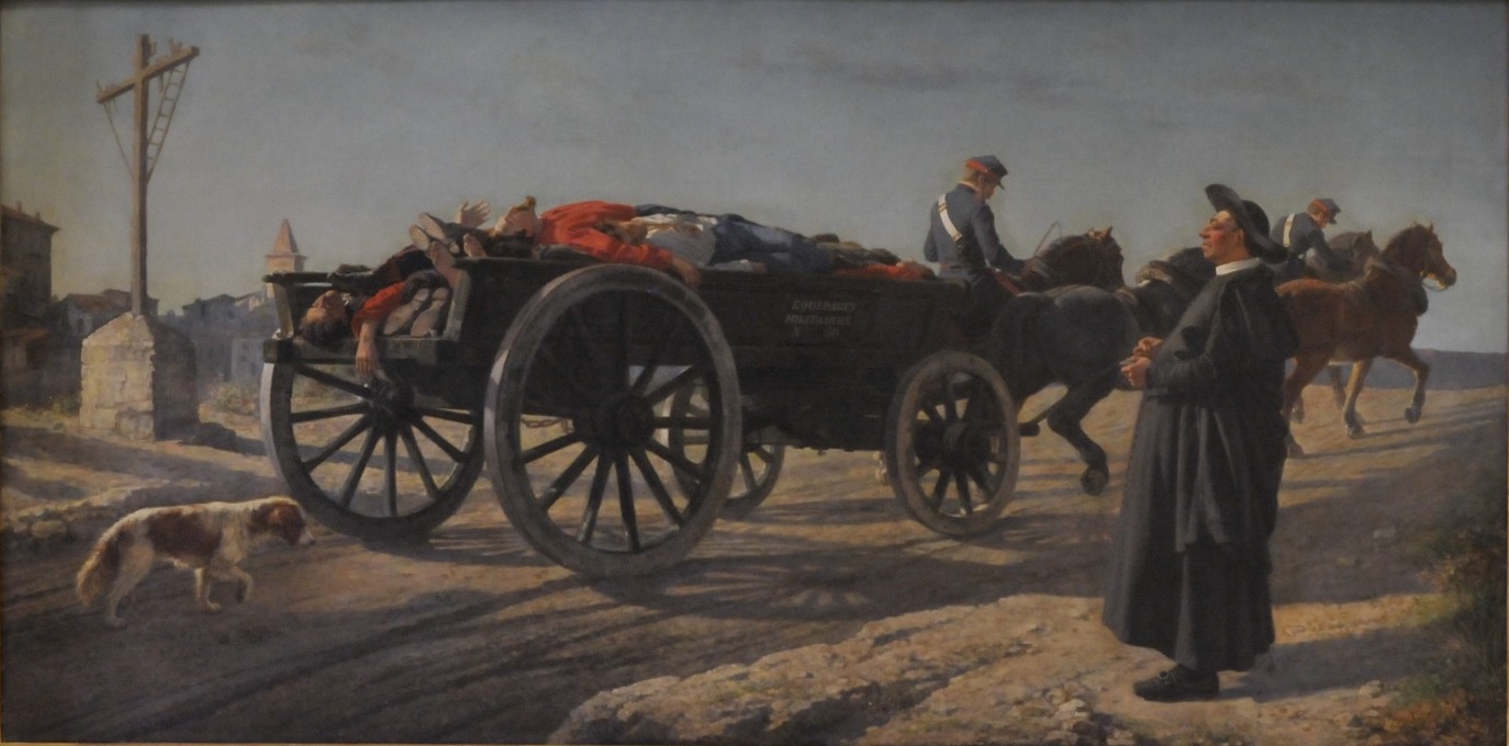 Nato a Foggia, a sedici anni, insieme al pittore foggiano Vincenzo Dattoli, Giuseppe De Nigris andò a Roma per ragioni di studio; ma fu tratto in arresto, per sospetta attività di carbonaro e rimandato in patria. Si trasferì quindi a Napoli dove studiò alla Real Accademia come allievo di Giuseppe Mancinelli. Partecipò a mostre della Promotrice napoletana, in particolare nel 1859 espose Paesaggio con Ossian e giovinetta che suona la cetra conservata nella Reggia di Caserta. Dopo una parentesi romana, fece ritorno a Napoli liberata dai Borboni e dopo l’Unità d’Italia aggiunse alle nature morte e alle scene di genere anche i soggetti patriottici e scene neo-pompeiane. Direttamente dalla Città metropolitana sono esposte due sue opere emblematiche: Le merveilles du chassepot che ritrae in un paesaggio desolato un carro francese, come testimonia la scritta “Equipages militaires n. 60”, trainato da due coppie di cavalli, guidati da due soldati, che trasporta i corpi dei valorosi garibaldini riconoscibili dalle loro camicie rosse. Esposto alla VII Promotrice napoletana del 1870 il dipinto fu eseguito nei primi mesi di quell’anno e si riferisce alla disfatta di Mentana delle truppe garibaldine, fermate il 3 novembre 1867 alle porte di Roma dai Francesi accorsi in difesa dello Stato Pontificio.