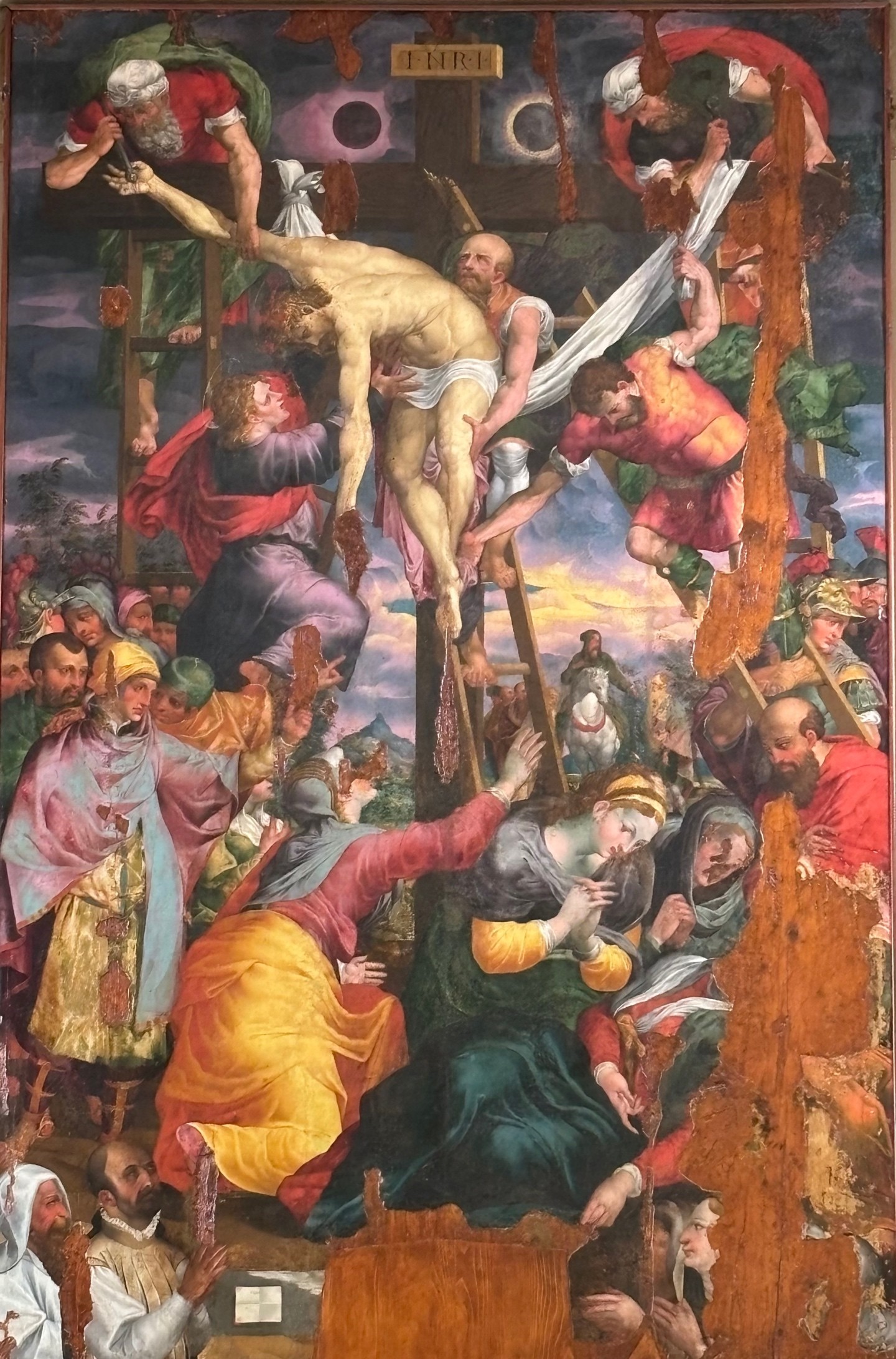 La composizione è affollata e concitata, al centro, la grande Croce con il corpo esanime del Cristo, sorretto da tre figure tra cui in posizione centrale il discepolo Giovanni. In cima, al di sopra, i due schiodatori appoggiati ai bracci della croce, in basso, Maria Maddalena e la Madonna accudita dalle pie donne. A chiudere lo spazio una folla di astanti, tra cui, i centurioni romani, un misterioso cavaliere e sulla sinistra di chi guarda un gruppo che assiste alla scena”.
