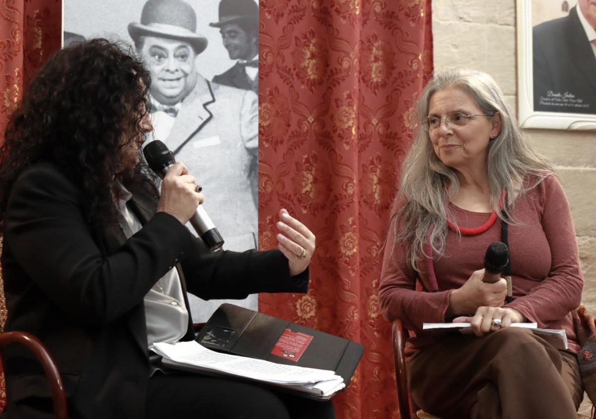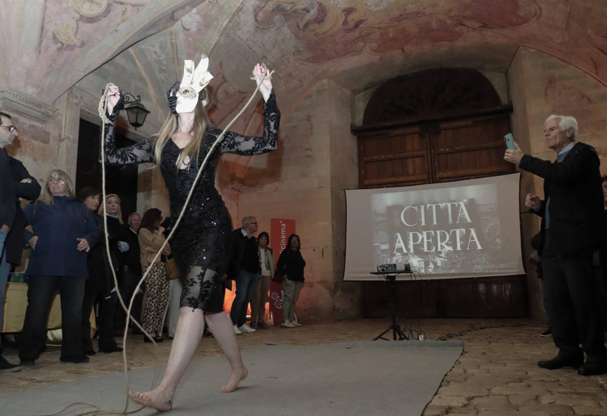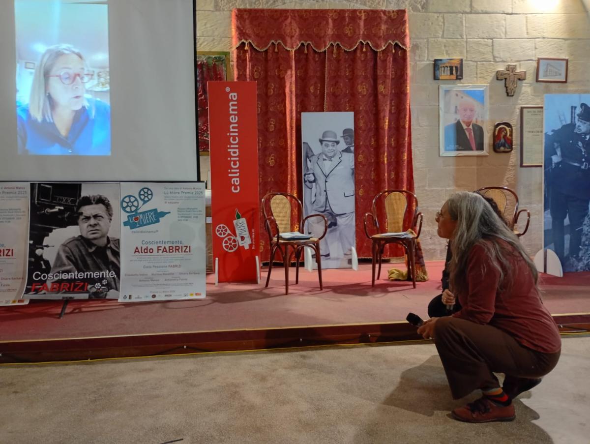 A dar l’avvio all’attesa intervista, la performance di Chiara Barbaro che ha danzato a piedi nudi, con il volto coperto da una maschera – come quelle molteplici che nascondono il volto di una società sempre più ingabbiata da pregiudizi e stereotipi – sulle note della colonna sonora di Roma città aperta, il capolavoro di Rossellini che usciva nelle sale ottanta anni fa. Ed ecco che, tra le sagome del commissario Lorenzo Bottoni in Guadie e ladri e Cesare Mancini in Hanno rubato un tram, Cielo Passione Fabrizi ha snocciolato ricordi e versi, alcuni di un’attualità disarmante come quelli scritti nel 1977 e che parlavano nientemeno dell’Onu.. ah?, la lungimiranza degli artisti che sanno inquadrare anzitempo, come in uno zoom, ciò che accadrà e Aldo Fabrizi, come l’amico Totò, aveva visto dove saremmo finiti con l’avanzare del progresso decantato simbolo di modernità. Sarà stata l’infanzia negata, perché chi resta orfano e deve diventare il capofamiglia deve rimboccarsi le maniche più degli altri, ma senza vittimismo e con grande determinazione, nonostante le difficoltà Aldo riuscì a dare concretezza alle sue idee incarnando il mito per cui gli americani avevano coniato l’espressione “Self-made man” . Generoso, nonostante la sua spigolosità, non ha rinunciato ai suoi sogni e nascendo poeta poi ha declinato tutti i linguaggi dell’arte: cinema, teatro, avanspettacolo…e gastronomia…pubblicando tre libri di ricette condite da riflessioni e stornelli attualissimi. È stato un padre e nonno affettuoso, presente con fittissime corrispondenze epistolari quando le tournée nei teatri lo portavano lontano da casa. Sono tantissime le lettere e le chiose, baci spesso associati ai frutti della terra – la mamma aveva infatti un banco di frutta a Campo de’ Fiori – omaggiato anche nell’omonima pellicola. «Aldo Fabrizi è sempre stato fiero delle sue origini e il suo primo film “Emigrantes” fu girato a Buenos Aires con pochi mezzi ma con tanto ingegno : la sera la compagnia recitava in teatro, al mattino diventava il cast di un film che la critica stroncò perché un comico non poteva essere anche regista…» praticamente un pioniere dell’odierno multitasking ma lui era oltre, troppo avanti per i suoi tempi. Difatti con alcuni suoi film “Vivere in pace” per certi versi anticipò il neorealismo e con la saga della famiglia “Passaguai” la commedia all’italiana… E se ha suscitato inevitabile ilarità la visione di alcuni frame, tratti proprio dalla “Famiglia Passaguai”, “Mi permetta babbo” con Alberto Sordi, e “Guardie e Ladri ” con Totò, grande commozione è stato la proiezione del video a sorpresa di Elena Anticoli De Curtis, nipote di Totò, che ha ricordato la loro grande amicizia che superò anche piccoli screzi perché entrambi leali ed eticamente impeccabili. Gli spari dei fuochi d’artificio della festa patronale in onore di San Vincenzo ci hanno fatto ricordare una delle gag preferite del Principe, proprio nel momento in cui si parlava di loro, l’oro di Napoli e di Roma, che hanno regalato al pubblico tante risate, inossidabili al tempo.