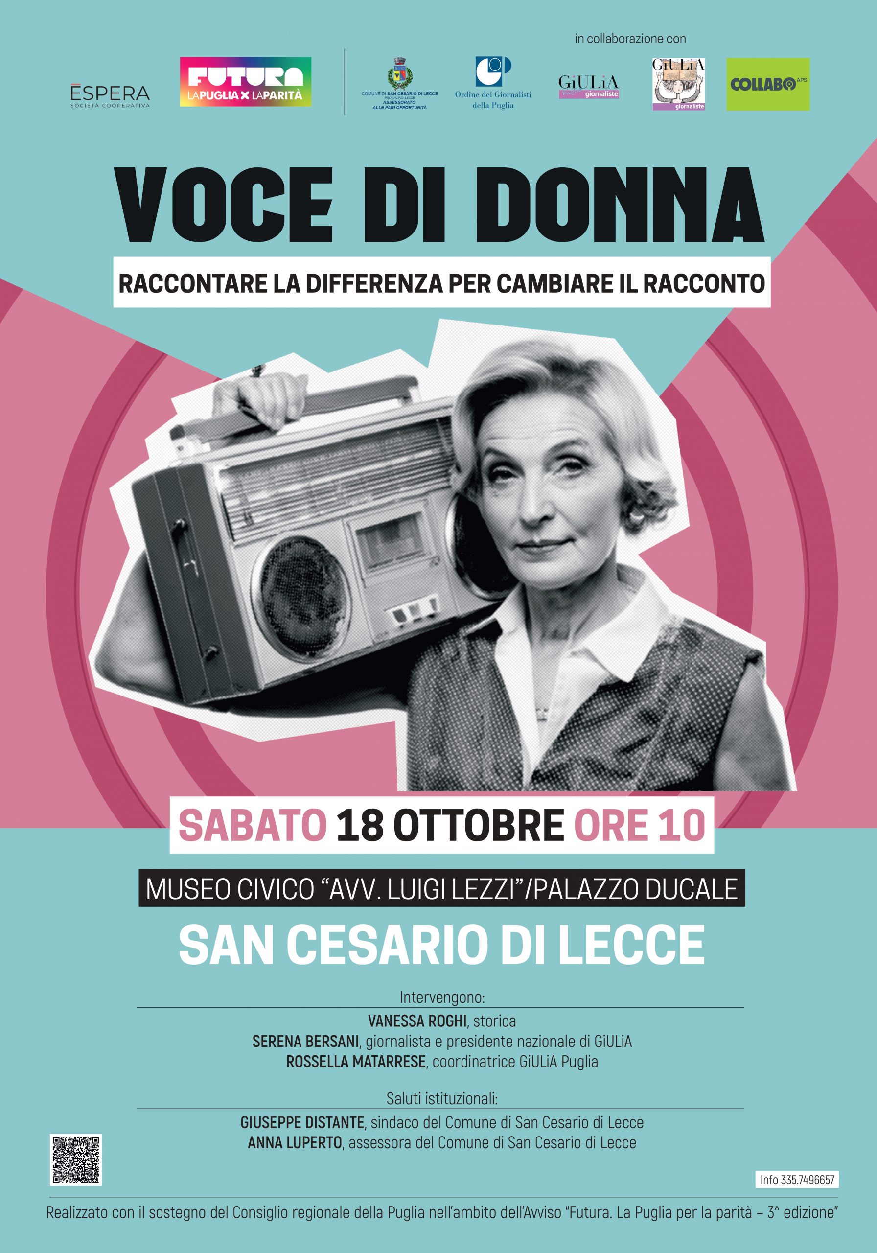 Intervengono: Vanessa Roghi, storica e autrice del podcast “La rivoluzione alla radio. Microfoni femministi dagli anni Settanta”; Serena Bersani giornalista e presidente nazionale di GiULiA (GIornaliste Unite LIbere Autonome) e Rossella Matarrese, coordinatrice GiULiA Puglia. Saluti istituzionali del sindaco di San Cesario di Lecce Giuseppe Distante e Anna Luperto, assessora alle Pari opportunità. Modera Laura Casciotti, giornalista Espera e quiSalento.