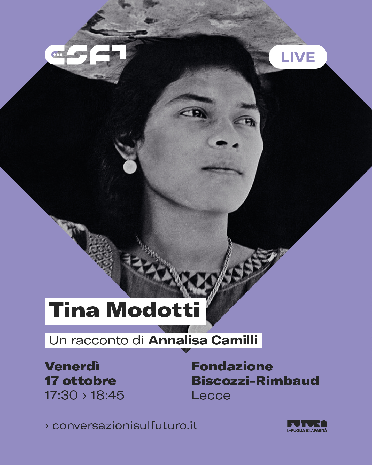 Nell’ambito della dodicesima edizione del festival Conversazioni sul futuro, promossa dall’associazione Diffondiamo idee di valore e in collaborazione con il progetto Futur?: femminismi, stereotipi e prospettive di genere,sostenuto dalla seconda edizione dell’avviso Futura – La Puglia per la parità, venerdì 17 ottobre 2025, alle ore 17.30, la Fondazione Biscozzi | Rimbaud ETS di Lecce ospita l’incontro Tina Modotti. Un racconto di Annalisa Camilli.