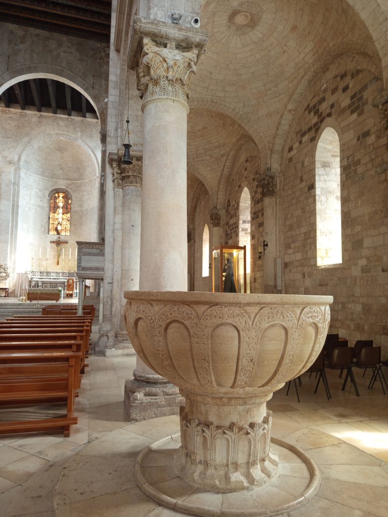 Sotto la seconda arcata destra si trova la monolitica vasca battesimale. Essa è ricamata con arcatine che presentano motivi vegetali ed è sostenuta da una colonna decorata con arcatine a motivi vegetali diversi dalla vasca.