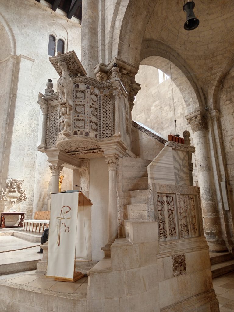 Di assoluto rilievo, accostato al pilastro destro dell’arco trionfale, il complesso e ricco ambone datato 1229 e firmato da Nicolaus, sacerdos e magister, realizzato quasi interamente in marmo, smontato nel ‘600 e rimontato nel secolo successivo. La lastra in bassorilievo riutilizzata nella scaletta dell’ambone raffigura quattro personaggi, uno seduto e tre in piedi,che molti studiosi ritengono membri della dinastia sveva, anche per la presenza di un uccello piumato, forse un’aquila, al margine inferiore sinistro.