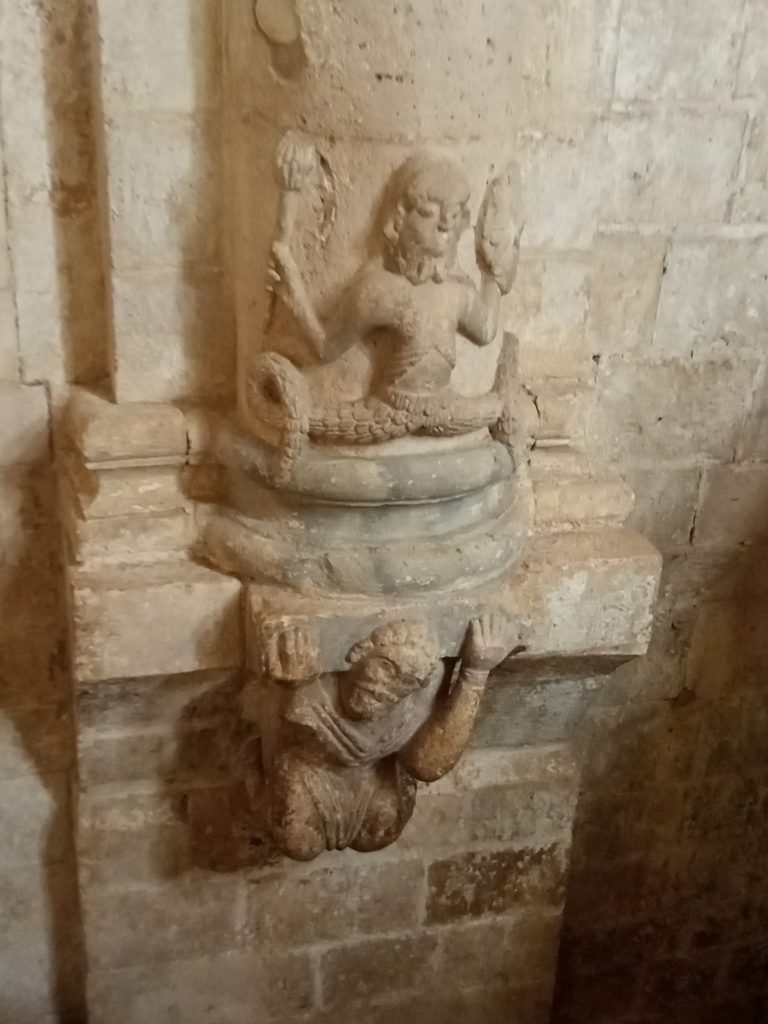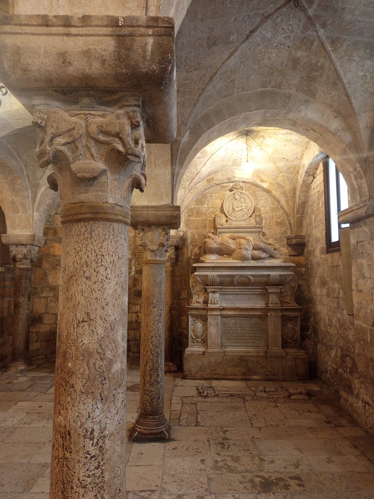 Tramite due scaloni, aperti alla fine delle navate laterali, si accede alla cripta a oratorio che si estende sotto il capocroce. La scala di sinistra mostra una scultura che raffigura l’essere leggendario del Mezzogiorno italiano dal XII secolo, Colapesce, metà uomo e metà pesce.