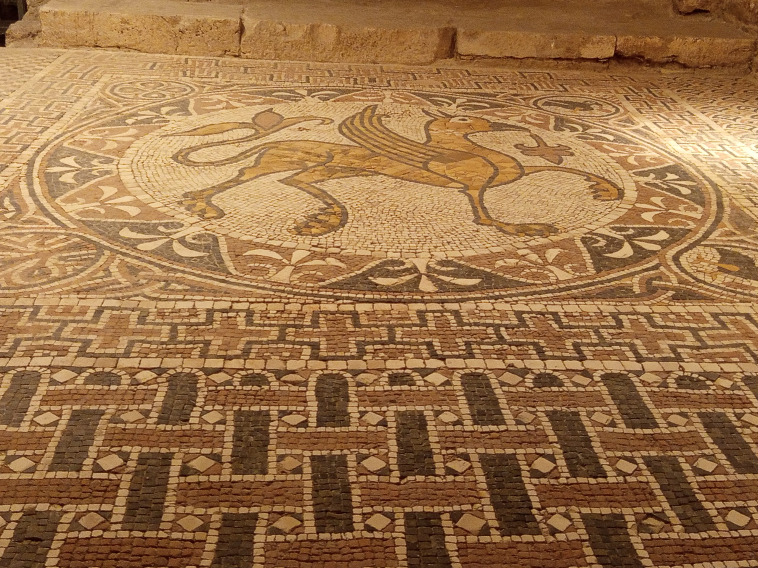 La fase più antica della basilica paleocristiana si colloca nei secoli V e VI. L’edificio di culto emerso dagli scavi è caratterizzato dal tipico impianto a tre navate, probabilmente con un’unica abside, demolita in seguito alla costruzione della cripta romanica all’inizio dell’XI secolo, e dalla presenza di una ricca pavimentazione a mosaico policromo. In particolar modo, di eccezionale valore è il ritrovamento del tappeto pavimentale raffigurante un gigantesco grifo dal cui becco fuoriesce un racemo gigliato; la bordura congiunge quattro clipei angolari entro cui insistono volatili pachidermici dal cui becco si originano una sorta di proboscide. Tale iconografia deriva dai ricami sui tiraz prodotti negli atelier normanni di Palermo e in epoca sveva diffusi nel resto dell’Italia meridionale. Il mosaico, interamente realizzato in opus sectile, è collocato all’interno di un poderoso corpo di fabbrica a pianta quadrata, a ridosso della basilica, che un’accreditata ipotesi interpreta come il punto in cui sorgeva una torre che comunicava con l’esterno attraverso una scalinata.