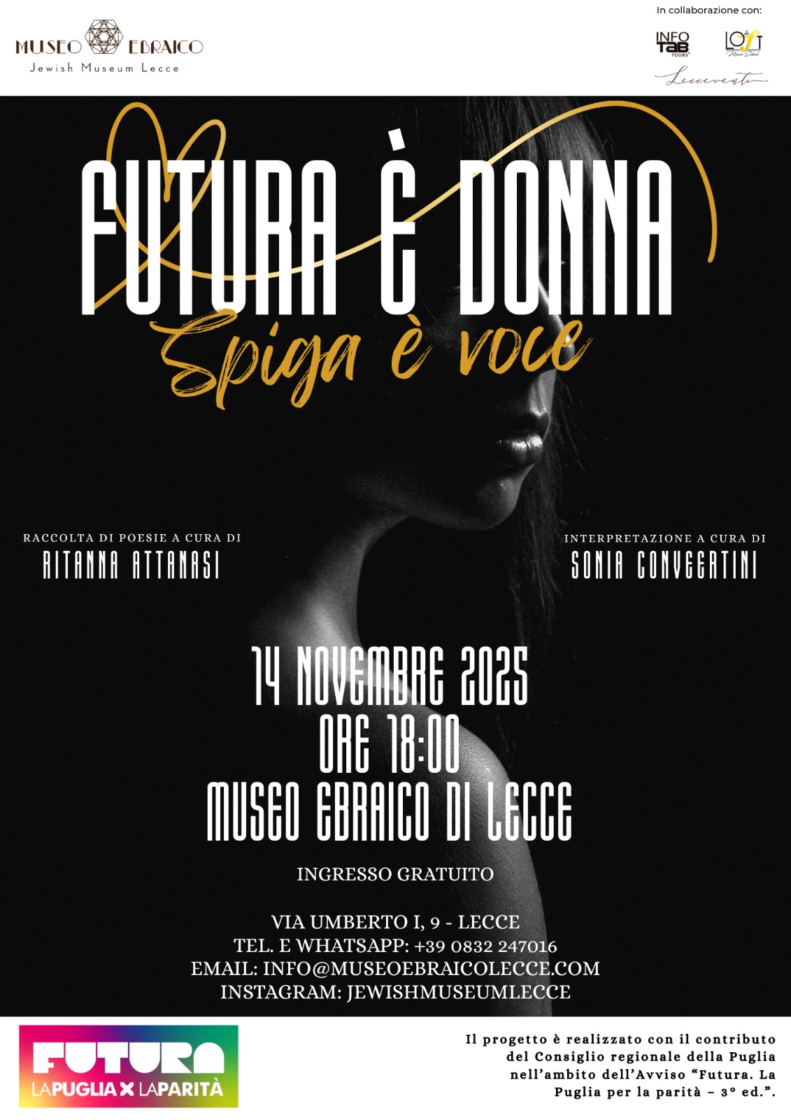 Secondo appuntamento al Museo Ebraico di Lecce con “Futura è donna. Spiga è voce”, una lettura poetica a cura di Ritanna Attanasi con interpretazione a cura di Sonia Convertini, che si terrà venerdì 14 novembre 2025 alle ore 18:00. Questo evento non si limita a offrire un’esperienza letteraria e performativa, ma si propone come momento di ascolto, memoria e consapevolezza, in cui la parola poetica diventa strumento per restituire spazio e voce all’esperienza femminile nella sua complessità.