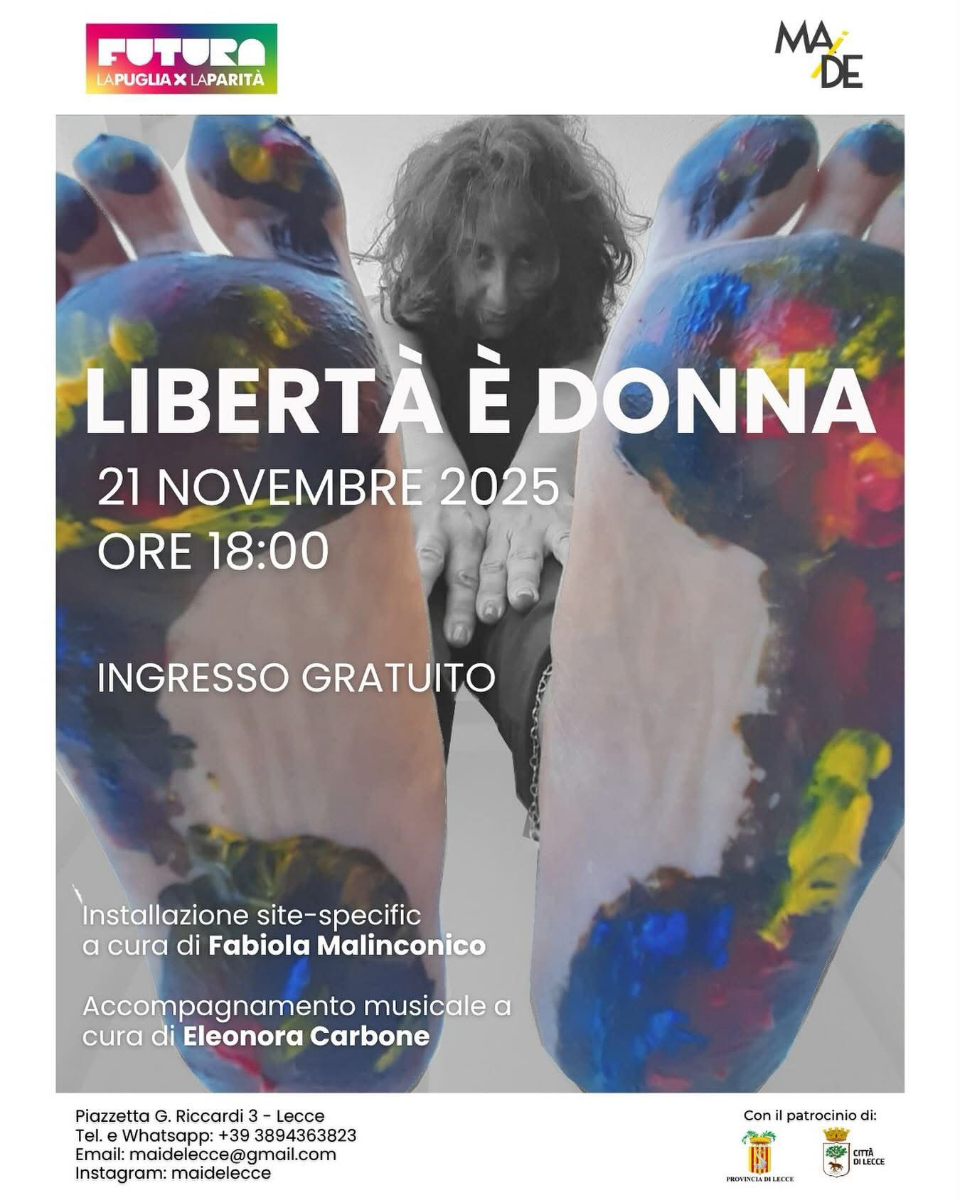 Venerdì 21 novembre, alle ore 18.00, la Galleria d’Arte MAiDE, in piazzetta Riccardi a Lecce, presenta l’evento “Libertà è donna”, una mostra site-specific a cura di Fabiola Malinconico. L’evento nasce come spazio di riflessione e consapevolezza, un momento in cui l’arte si fa strumento di ascolto, memoria e partecipazione collettiva. L’opera di Fabiola Malinconico, realizzata appositamente per l’occasione con tecniche polimateriche su juta, racconta il cammino della donna dall’invisibilità alla luce, dalla costrizione alla libertà, divenendo simbolo di emancipazione e resistenza.