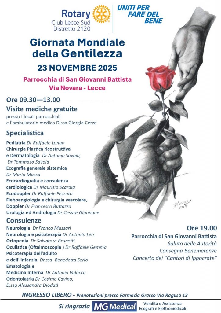Dopo il successo dello scorso anno, si rinnova al Quartiere Stadio la Giornata della Gentilezza “Uniti per fare del bene” ovvero una mattinata dedicata agli screening gratuiti per iniziativa del Rotary Club Lecce Sud.Grazie al coordinamento della farmacia Grasso di Lecce. Domenica 23 novembre,dalle 9:30 alle 13:00, i locali dell’Oratorio della parrocchia di San Giovanni Battista si trasformeranno in un poliambulatorio con tanti specialisti che gratuitamente svolgeranno consulenza e visiteranno i pazienti che avranno prenotato gratuitamente in farmacia (Lecce, via Ragusa, 13).