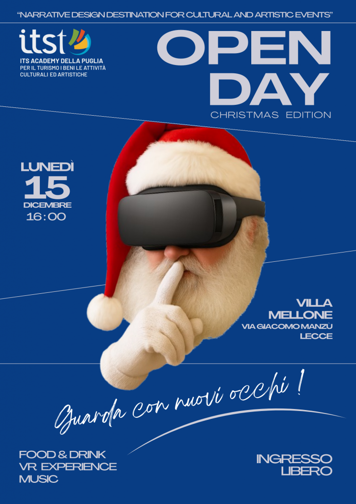 Lunedì 15 dicembre 2025, alle ore 16.:00, presso Villa Mellone, tra le storiche dimore extraurbane del Salento, nella valle della Cupa e a pochi passi dall’area archeologica dell’antica Rudiae, l’ITS Academy della Puglia per il Turismo, i Beni e le Attività Culturali ed Artistiche presenta l’Open Day Christmas Edition. L’evento nasce con l’obiettivo di illustrare al pubblico l’offerta formativa dell’ITS Academy e di approfondire le caratteristiche dell’Istruzione Tecnologica Superiore, un percorso post-diploma che integra attività teoriche, laboratori operativi ed esperienze professionali sviluppate in collaborazione con imprese e operatori del settore turistico e culturale.