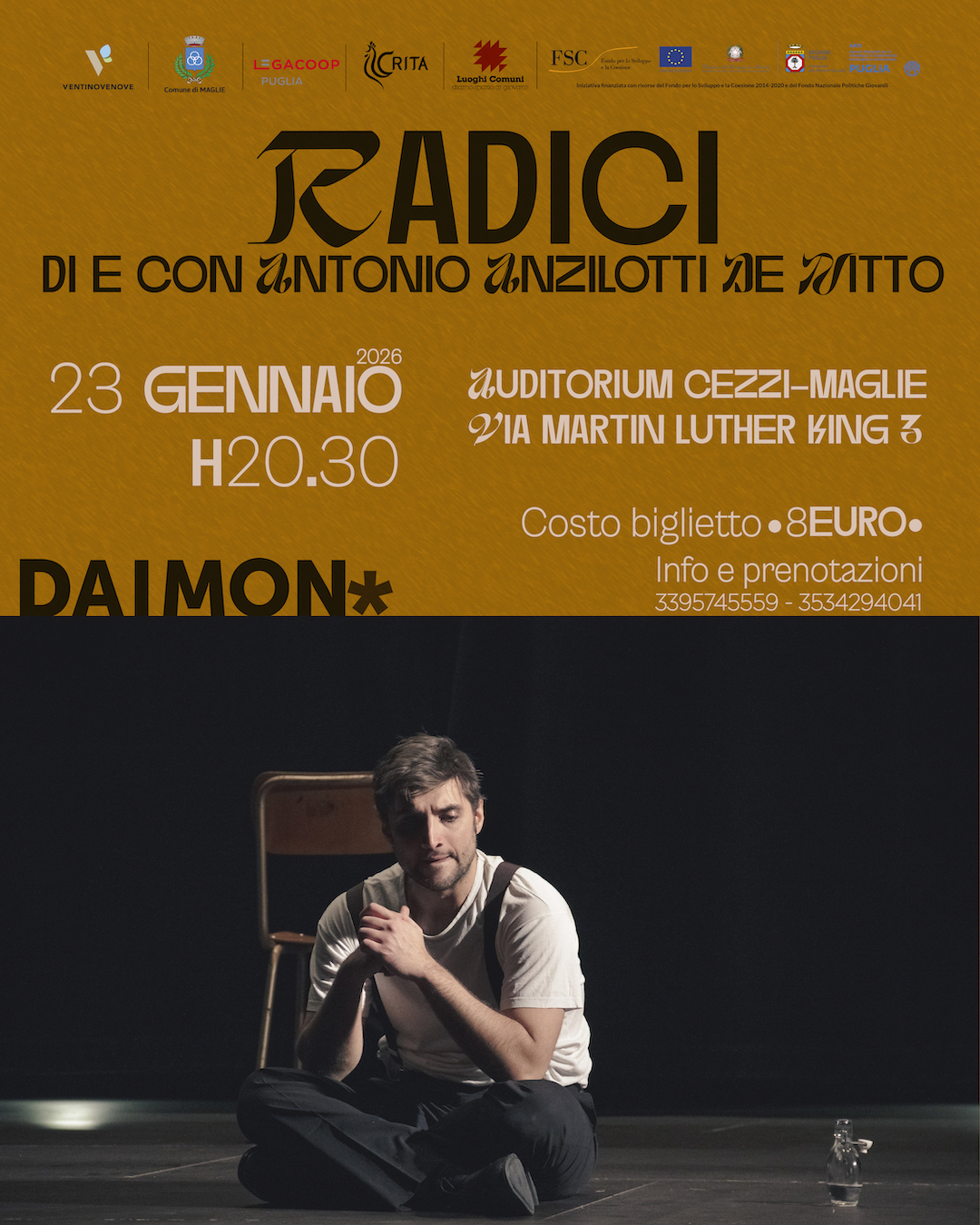 L’anno di programmazione di “Daimon” all’Auditorium Cezzi di Maglie, il progetto della cooperativa Ventinovenove vincitore del bando Luoghi Comuni, riprende venerdì 23 gennaio alle 20.30, con il pluripremiato spettacolo “Radici” di e con Antonio Anzilotti De Nitto.