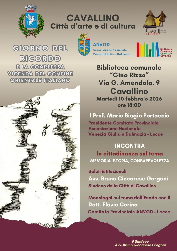 Ad aprire l’incontro saranno saluti del Sindaco della Città di Cavallino, Avv. Bruno Ciccarese Gorgoni. Monologhi sul tema dell’Esodo con il Dott. Flavio Corina (Comitato Provinciale ANVGD Lecce). Ingresso libero.