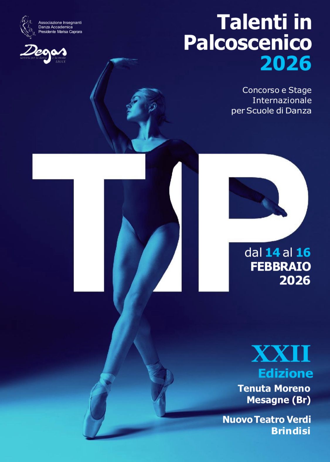 Brindisi – È finalmente giunto il momento che tutti gli appassionati di danza stavano aspettando: la XXII edizione di Talenti in Palcoscenico si svolgerà dal 14 al 16 febbraio 2026 presso la splendida Tenuta Moreno di Mesagne e il Nuovo Teatro Verdi di Brindisi. Il concorso e stage internazionale per scuole di danza, organizzato da Pierluigi Valentini, si prefigge come sempre di essere un evento straordinario, ricco di emozioni e opportunità per giovani talenti.