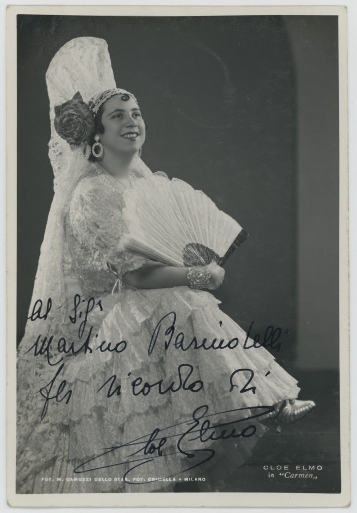 E la leccese Cloe Elmo è stata una donna e un’artista straordinaria. Con una innata vocazione per il canto, i suoi genitori Arturo Gaetano e da Teresa Torsello, la fecero studiare con il maestro Sisi Pecoraro ma senza trascurare la formazione umanistica Cloe frequentò brillantemente il liceo Palmieri di Lecce per poi trasferirsi a Roma dove iniziò gli studi musicali presso l’Accademia di S. Cecilia nella classe di canto di Edwige Ghibaudo. Il 10 gennaio del 1931 nella sala dell’attuale istituto Costa di Lecce è invita ad inaugurare dagli ” Amici della Musica “un ciclo di concerti con un recital “lungamente e sinceramente applaudito “.