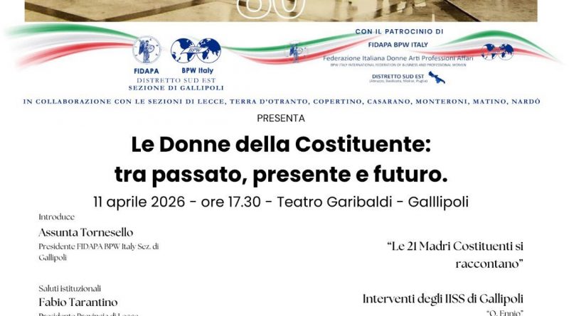 7 Aprile 202611 Aprile 2026 Staff 0 commenti Costiruzione, Donne, Fidapa, Gallipoli, le donne della Costituente, Teatro Garibaldi